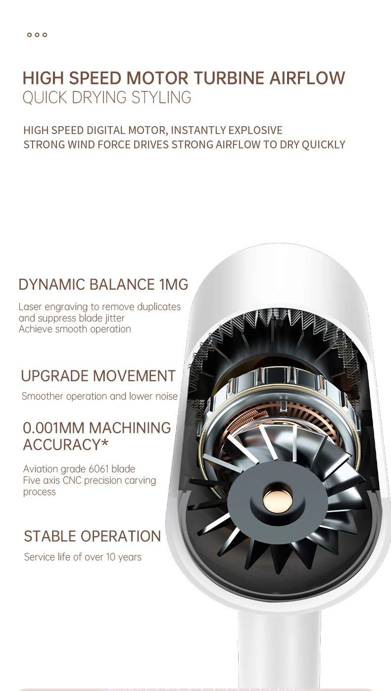 • 고속 전기 터빈 기류:머리를 빠르고 효율적으로 건조하도록 설계된 고속 전기 터빈 기류의 힘을 경험하십시오.