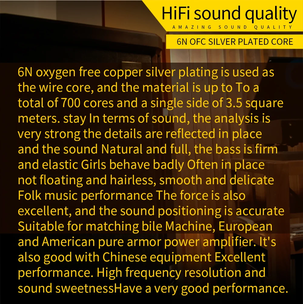 6N oxygen free copper silver plating is used as the wire core, and the material is up to To a total of 700 cores and a single side of 3.5 square meters. stay In terms of sound, the analysis is very strong the details are reflected in place and the sound Natural and full, the bass is firm and elastic Girls behave badly Often in place not floating and hairless, smooth and delicate Folk music performance The force is also excellent, and the sound positioning is accurate Suitable for matching bile Machine,European and American pure armor power amplifier. It’s also good with Chinese equipment Excellent performance.High frequency resolution and sound sweetness Have a very good performance.