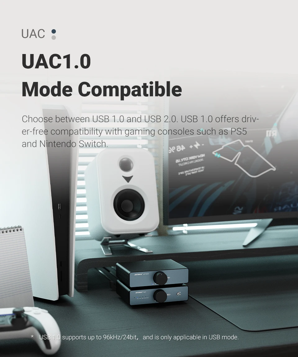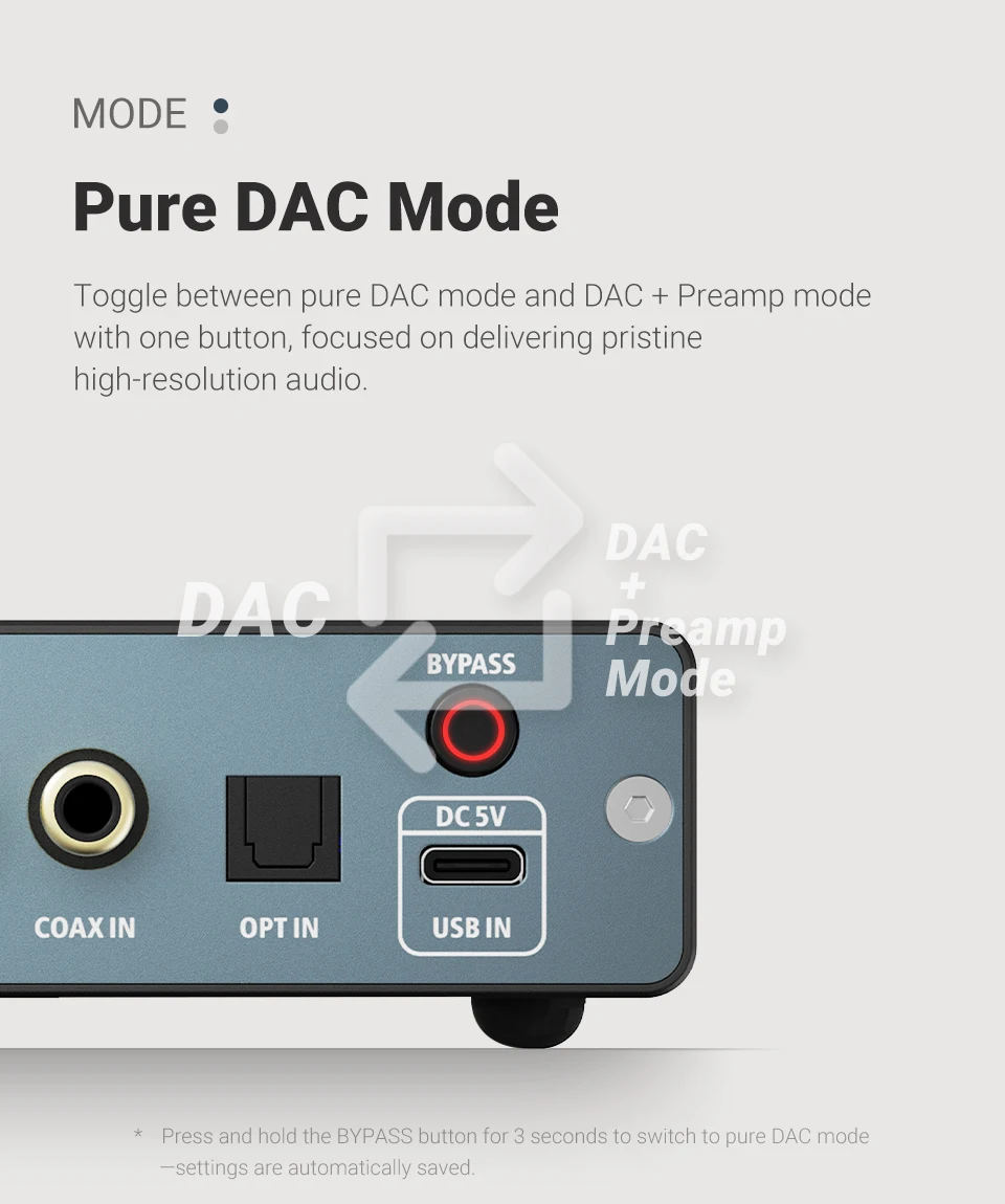 4.원터치 전환 및 광범위한 장치 호환성: 순수 DAC 모드와 DAC + 프리앰프 모드 간을 쉽게 전환할 수 있습니다.BYPASS 버튼을 3초 동안 길게 눌러 순수 DAC 모드를 활성화하세요. 전원을 껐다가 다시 켜면 BYPASS 기능이 자동으로 다시 활성화됩니다.두 가지 USB 모드를 제공합니다: USB 1.0(다양한 게임 콘솔에 쉽게 연결할 수 있는 드라이버 프리 모드) 및 USB 2.0.